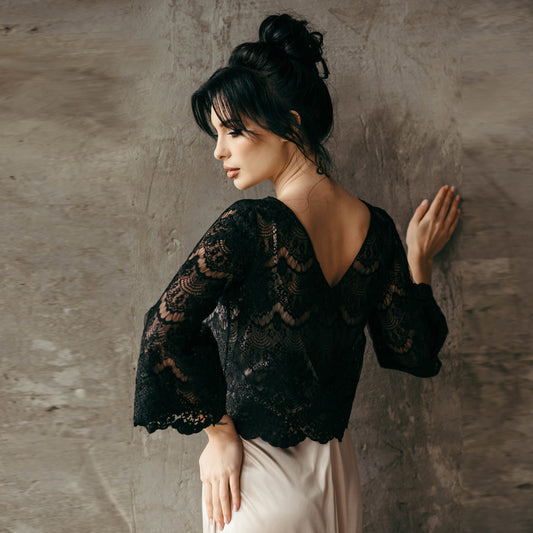 Black Wedding Dress Topper - Long-Sleeved Black Lace Bridal Top