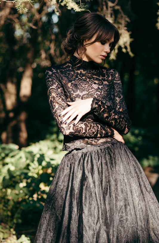 Black Lace Bridal Top – High Neck with Button Back