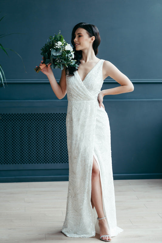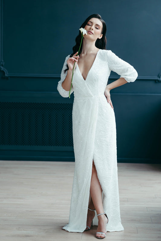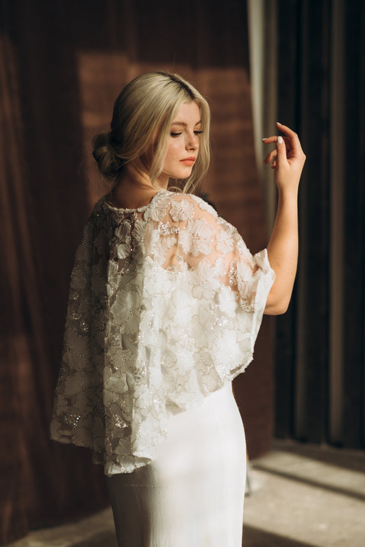 Lace Bridal Cape with Sleeves – Sequins and Flowers